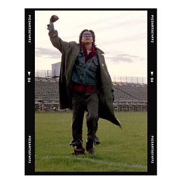 Walking alone across an empty football field in a denim jacket and fingerless gloves. Wind in his hair. Bruises on his ego. The school day is over. Detention is done. E.g.:John Bender, 1985. The Breakfast Club.
